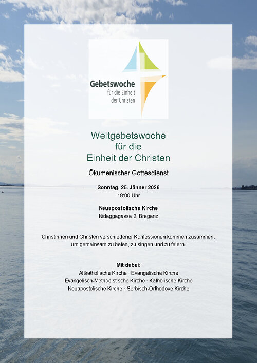 25.01.2026, 18:00 Uhr Ökumenischer Gottesdienst zur Weltgebetswoche der Christen Neuapostolische Kirche in Bregenz Nideggegasse 2 6900 Bregenz Mehr lesen